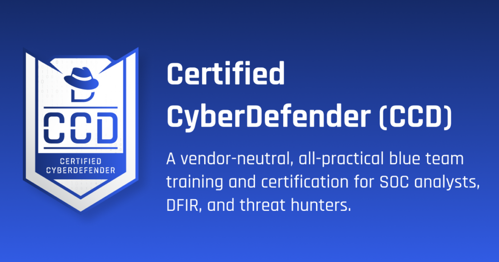 The Certified CyberDefender (CCD) is a comprehensive, hands-on blue team cybersecurity training and certification designed to develop elite defensive skills for Security Operations Center (SOC) analysts, threat hunters, incident responders, and DFIR professionals. This self-paced program emphasizes real-world readiness through practical investigations and realistic scenarios that mirror on-the-job challenges in modern SOC environments.